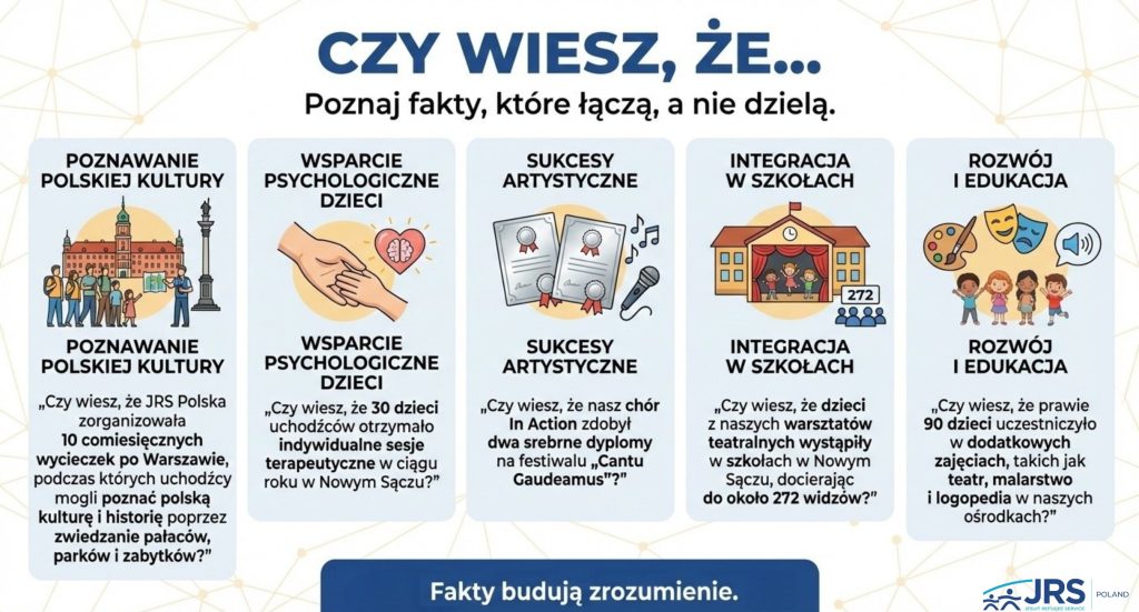– „Czy wiesz, że JRS Polska zorganizowała 10 comiesięcznych wycieczek po Warszawie, podczas których uchodźcy mogli poznać polską kulturę i historię poprzez zwiedzanie pałaców, parków i zabytków?”