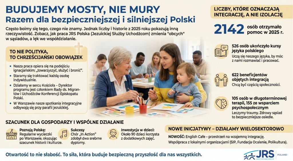 Początek roku jest dobrym momentem żeby spojrzeć wstecz. A jest na co! W minionych 12 miesiącach JRS Polska stworzyło przestrzeń spotkania, rozmowy, bliskości i wsparcia dla wielu, wielu osób. I nie liczby są najważniejsze. Za każdą z nich kryje się bowiem konkretna osoba, która ma imię, twarz, historię. jesteśmy bardzo wdzięczni, że możemy towarzyszyć każdej z tych osób. JRS Polska jest właśnie dla migrantów oraz uchodźców, którzy takiego spotkania szukają!
