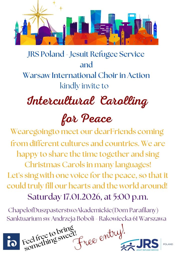 Drodzy Przyjaciele i Sympatycy JRS, wspólnie z Chórem „W Akcji” zapraszamy Was serdecznie na nasze coroczne międzykulturowe kolędowanie w intencji pokoju. Już w sobotę 17 stycznia, jak co roku spotkamy się z naszymi Przyjaciółmi i Znajomymi z różnych kultur, aby wspólnie śpiewać kolędy w wielu językach świata.