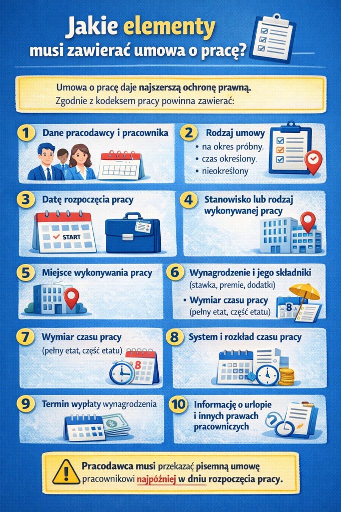 | Element | UMOWA O PRACĘ | UMOWA ZLECENIA | UMOWA O DZIEŁO |