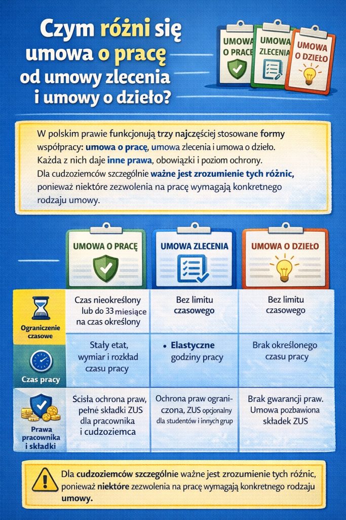 Uwaga: Jeśli cudzoziemiec wykonuje pracę jak pracownik (stałe godziny, jedno miejsce, podporządkowanie pracodawcy), a ma umowę o dzieło – zatrudnienie może zostać uznane za nielegalne.