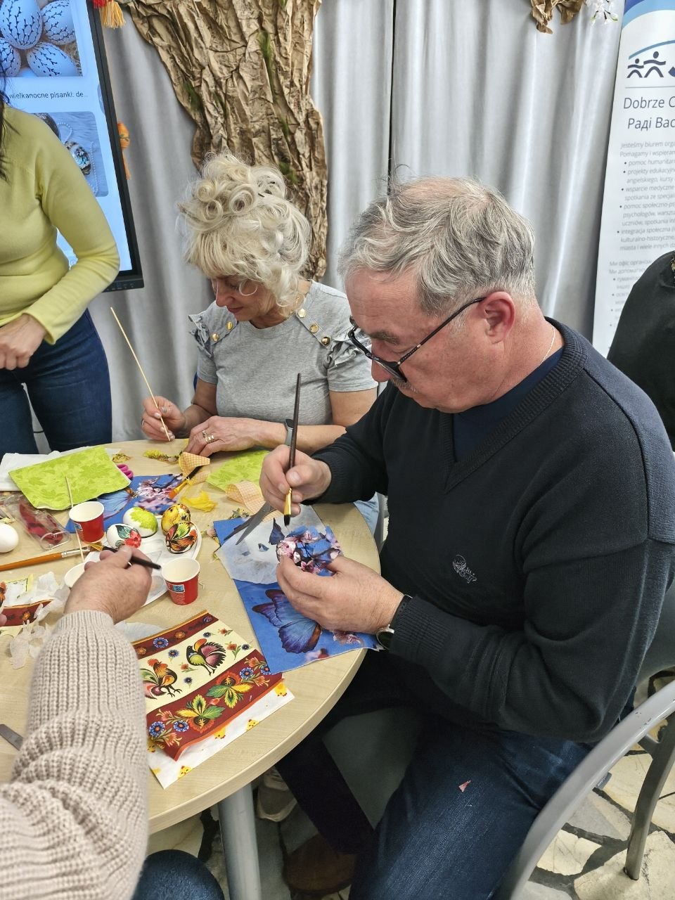W drugiej części spotkania odbyły się warsztaty dekorowania jaj wielkanocnych w technice ekodecoupagu, które cieszyły się dużym zainteresowaniem i zaangażowaniem uczestników.